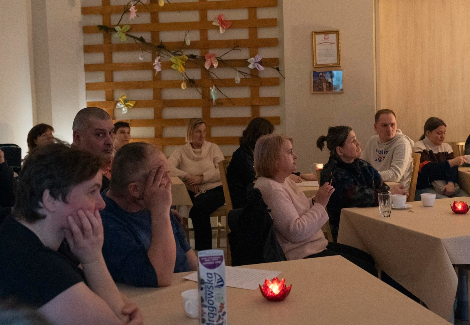 4.Grupa osób siedząca przy stolikach ze świeczkami.